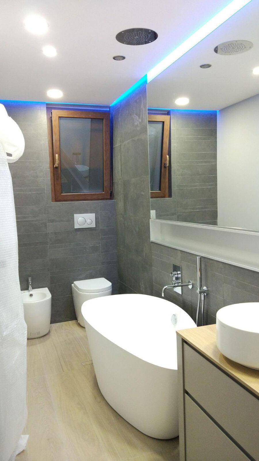 Lieferung: Gessi Via Tortona Armaturen, Bossini Deckenbrause, Abk Docks graue Beschichtung, Compab Möbel