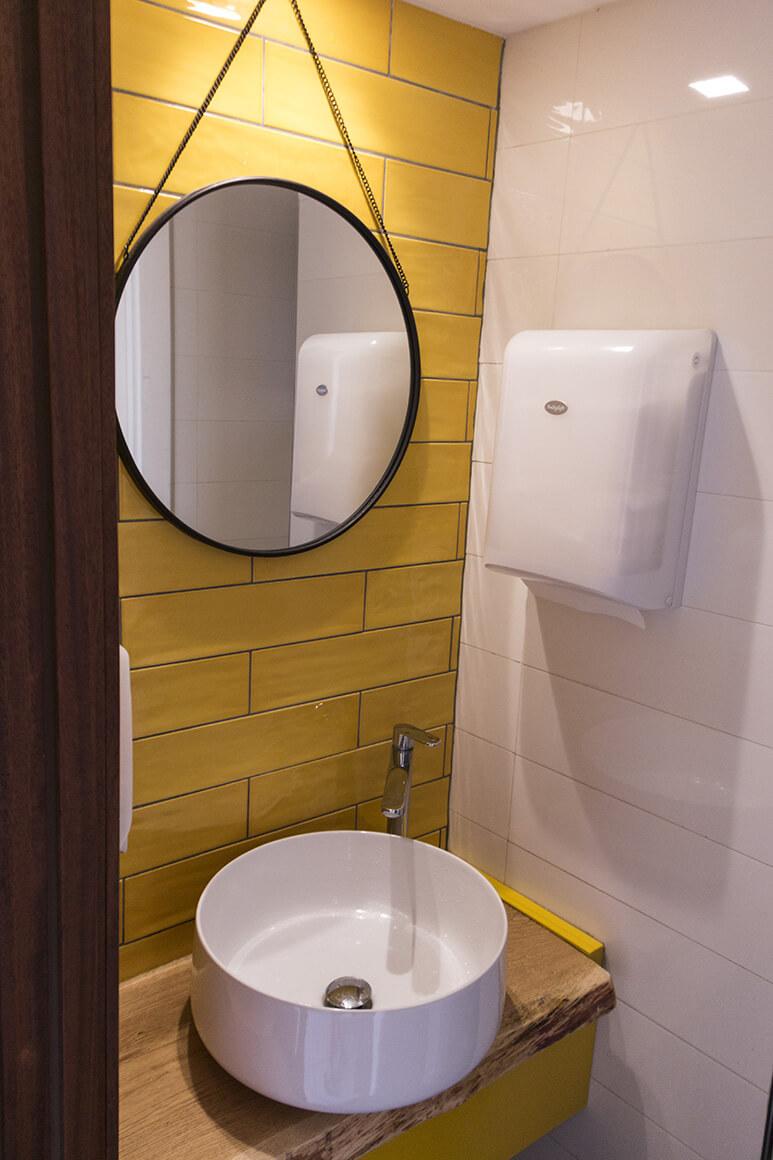 Ein Raum mit einem starken zeitgenössischen Geist, der sich in der Verwendung von Farben und Eisen für ein lebendiges und dynamisches Design zeigt, das die Zielgruppe anspricht.